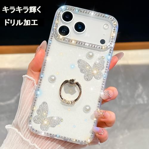 YUYIB iPhone 17 Pro 用 クリアケース リング付き ケース ドリル きらきら ブリンブリン かわいい スタンド機能 おしゃれ キャラクター 軽量 薄型 衝撃吸収 女性人気 ストラップ穴あり スマホケース アイホン 17プロ 透明カバー (蝶2)