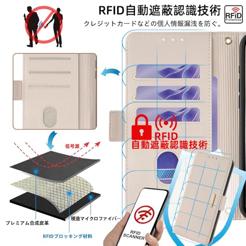 【機能性4:カード収納と安全保護】窓口式のカードスロットとサイドポケットも装備しております。ちょっとした外出する際に、財布が無くても手帳型ケースだけで十分です。内蔵マグネットの留め具なのでピタッと閉まります。クレジットカードなどの情報漏洩を防ぐために、カード入れの内側にRFID自動遮断の素材を採用します、無接触なプライバシー盗難から個人情報を防衛します。ご注意:電磁波を遮蔽する素材なので、カードをいれたままの読み取りはできません。