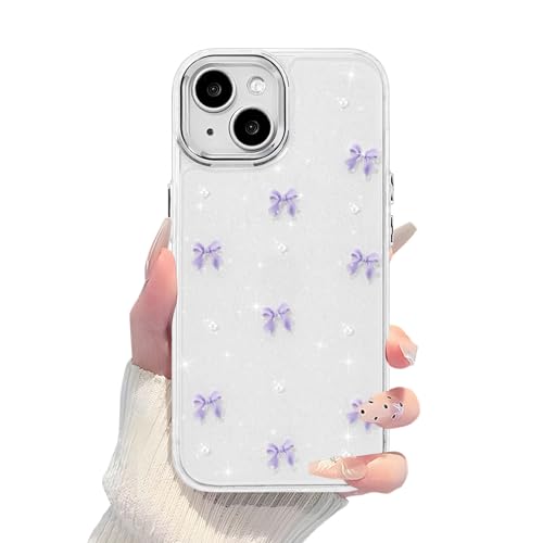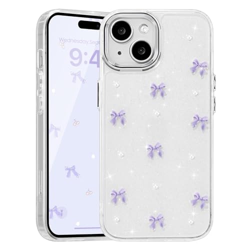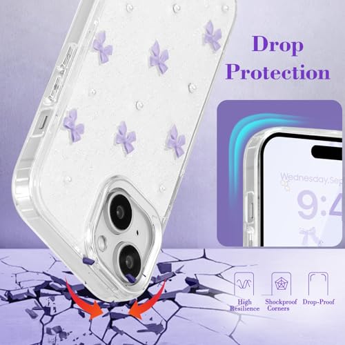 EYZUTAK ケース 対応 iPhone 15 Plus 用の 保護ケースおしゃれ 可愛い 韓国 クリア りぼん立体感装飾 きらきら ラメ入り 透明TPU薄型 軽量 耐衝撃 擦り傷防止 保護カバー - 紫のリボン