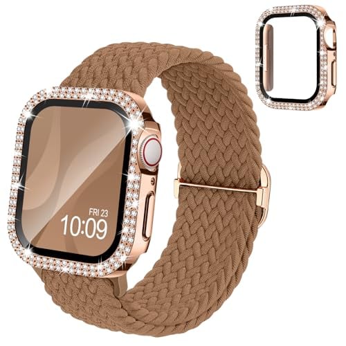 [Missair] コンパチブル Apple Watch バンド ナイロン アップルウォッチ バンド 編み込み ゴム キラキラ カバー付き ダイヤモンド 互換用のApple Watch ベルトとケース 一体型 全面保護 オシャレ レディース (Series11/10 42mm)