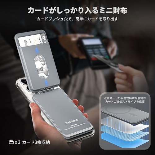 対応機種:本製品はiPhoneiPhone 17/16/15 /14/13/12/iPhone17/16/ 15/14/13/12 plus/iPhone17/16/ 15 /14/13/12/pro /iPhone 17/16/15/14/13/12 pro maxのベアボーンに直接使用でき、その他のシリーズには リードマグネットリングを使用することができます。 Androidシリーズ及びiPhone12以下は、付属のスマートフォン用メタルリングを使用することでうまく使用することができます、(金属リングをスマホの背面またはケースの背面に取り付けてください。) 2in1のカードホルダーとスマホホルダーは、1つでスタンドやカードケースとして機能します。 マグネット式のスタンドでスマホをスムーズに保持できるので、様々なシーンで自由に使用でき、より便利な生活を楽しむことができます