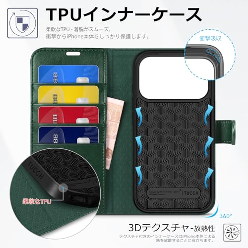 TUCCH iphone 17 Pro 対応 ケース手帳型 6.3インチ RFIDブロッキング 4つカードポケット付き ストラップホール 横置きスタンド機能 衝撃吸収 全面保護 PU合皮 TPU素材 マグネット式 アイホン17プロ対応 携帯カバー 2025年発売 5G エバーグリーン