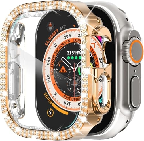 AIYYXX Apple Watch Ultra 3/2/Ultra 1 ケース(2025/2024/2023/2022 49mm)対応 apple watch ultra カバー 本体 ダブルダイヤモンド ガラスフィルム付 超薄型 PC+ガラス素材 高透過率 キズ防止 簡単に取り付け・取 全面保護 アップルウォッチ ウルトラ2 カバー(PC+保護フィルム・ローズゴールド)
