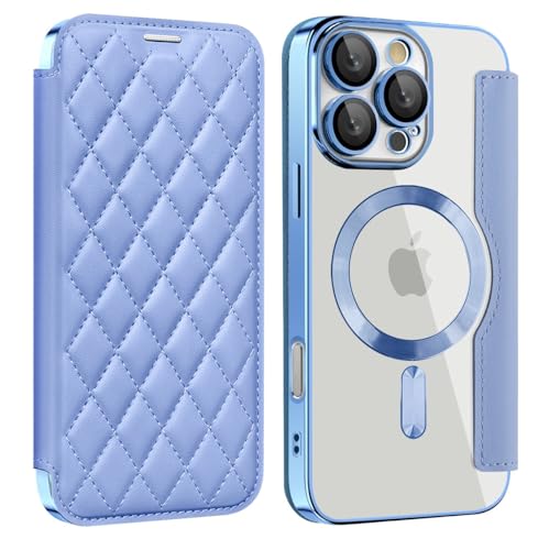 iPhone 16 Pro ケース 手帳型 MagSafe対応 キルティング 背面透明 クリア 可愛い 女性 手帳 iPhone16 Pro ケース チェエック 格子柄 ゴージャス カード収納 財布型,薄ブルー