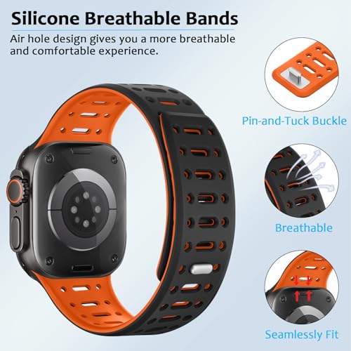 [Amizee] コンパチブル アップルウォッチ マグネチッ バンド 49/46/45/44/42/41/40/38mm ソフトシリコン通気性ストラップ Ultra 3/2/1 シリーズ 11 10 9 8 7 6 5 4 SE3/2/1 用(ブラック/オレンジ, 42mm/44mm/45mm/46mm/49mm)