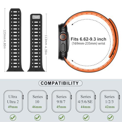 [コンパチブル モデル& サイズ]: Amizee マグネット シリコン watch バンド コンパチブル と 42mm 44mm 45mm 46mm 49mm ultra3(2025)/2/1 (49mm), シリーズ 11/10 (46mm),SE (3/2/1)/6/5/4 (44mm),シリーズ 9/8/7 (45mm), シリーズ 3/2/1 (42mm), 6.71"-9.3"インチの手首にフィット(169mm-235mm). 注:ご注文の前に、時計の裏側に記載されているサイズをご確認ください。