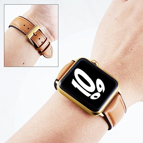 コンパチブルApple Watchバンド レザー 通気性 内側にシリカゲル 42MM/44MM/45MM/46MM/49MM エレガント互换アップルウォッチの 革ベルトスポーツ男女共用 対応iWatch 10/9/8/7/6/5/4/3/2/1/Ultra/SE (ライトブラウン/ゴールド バックル)
