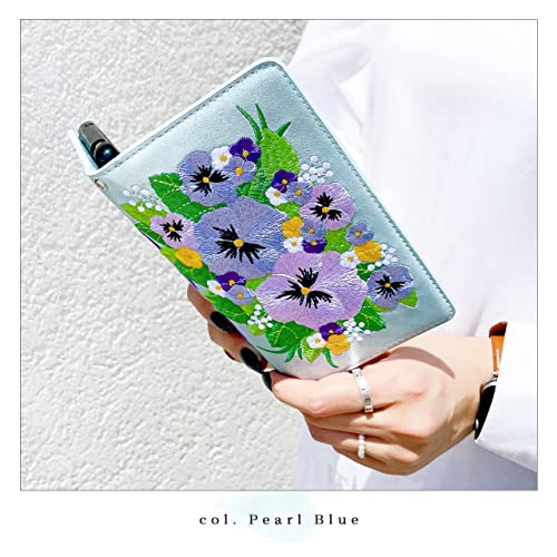 【パンジーの花束をフェルト刺繍した華やかな手帳型ケース】印刷ではなく実際に刺しゅうを施しているため、刺繍の部分が若干膨らんでいる場合がございますが、不良品ではございませんので、予めご了承ください。開閉部分にマグネットを内蔵しておりますが、磁器エラーを防ぐために磁器を弱めにしております。カチッと留まるほどではございませんので、予めご了承ください。