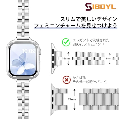 [SIBOYL]全面的な保護41mmカバー対応超細アップルウォッチ バンド 9 8 7【超高透過率、耐衝撃、上質な強化ガラスフィルムのアップルウォッチ カバー】 取り付け簡単のあっふウォッチバンドとケース、おしゃれコンパチブルApple Watch ベルトステンレス、かわいいあっふウォッチバンドレディース対応のiWatch 9 8 7-シルバー&シルバーカバー