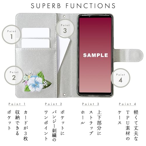 Xperia 10 IV 専用 SO-52C SOG07 A202SO ケース カバー 手帳型 SO-52Cケース SO-52Cカバー SOG07ケース SOG07カバー エクスペリア Xperia10IV ハンドあり パンジー 刺繍 シルバー
