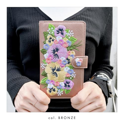 内側にはカードなどが収納できるポケット付きの、実用的なハンドあり手帳型ケースです。高級感のあるサフィアーノ調生地に華やかで上品なオリジナルデザインのパンジー刺繍を施しています。ストラップ穴付きのため、チェーンを付けたりストラップを付けることが可能となります。