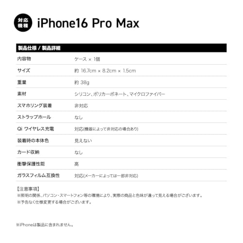 【製品仕様】… ◆ 対応機種 : iPhone 16 ProMax ( アイフォン16 プロマックス ) ◆ 内容物 : ケース × 1個 ◆ サイズ : 約 16.7cm × 8.2cm × 1.5cm ◆ 重量 : 約 38g ◆ 素材 : シリコン、ポリカーボネート、マイクロファイバー