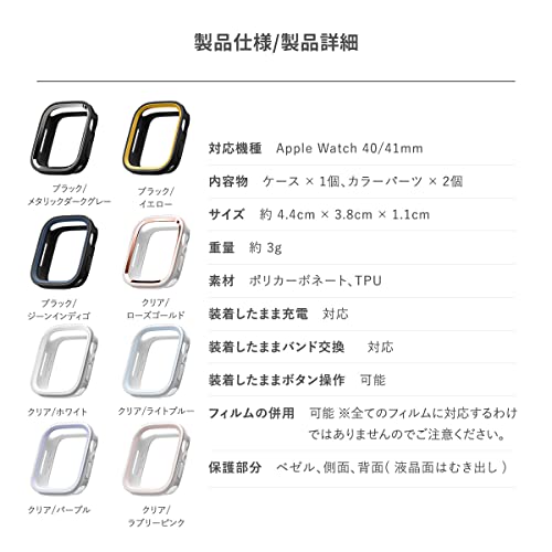 【製品仕様】… ◆ 対応機種 : Apple Watch Series 9 / 8 / 7 / 6 / 5 / 4 / SE2 / SE 40 / 41 mm ◆ 内容物 : ケース × 1個、カラーパーツ × 2個 ◆ サイズ : 約 4.4cm × 3.8cm × 1.1cm ◆ 重量 : 約 3g ◆ 素材 : ポリカーボネート、TPU