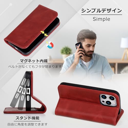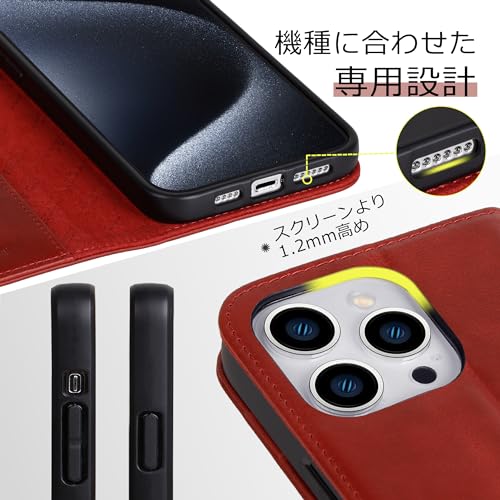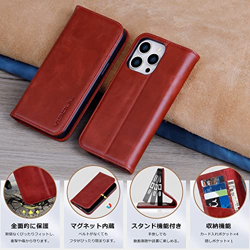 VISOUL iPhone15Pro Max ケース 手帳型 本革 MagSafe対応 アイフォン15プロマックス 手帳型ケース スマホケース レザーケース カード収納 携帯ケース 全面保護 柔軟なTPU素材 マグネット式 スタンド機能付き 6.7インチ対応 アイホン15Pro Max レッド