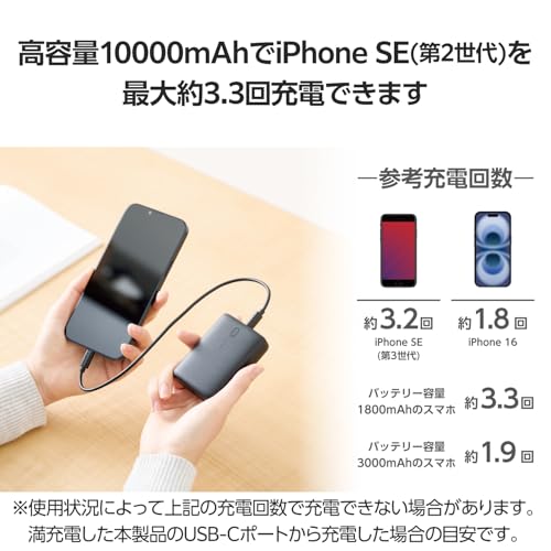 USB Power Delivery 30W対応の高出力でスマートフォンやタブレット、ノートパソコン、ゲームなどを充電できる、10000mAhのモバイルバッテリーです。