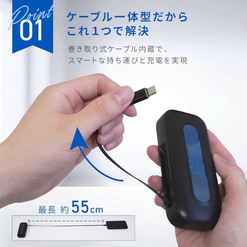 巻き取り式ケーブル一体型のモバイルバッテリー:本製品は容量10000mAhのモバイルバッテリーです。巻き取り式のUSB Type-Cケーブルが内蔵されているため、ケーブルを持ち歩かずに充電ができます。