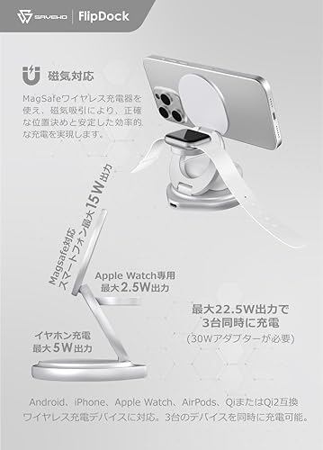 SAVEWO【Qi2認証・15W急速充電対応】FlipDock 3-in-1 ワイヤレス充電スタンド 折り畳み式 回転式 磁気充電器 3台同時充電 iPhone 16/15/14/13/12 seris/Galaxy S20/S10/S10+/S9/Airpods 2/3/pro/Apple Watch 各種対応 MagSafe対応 持ち運び便利 卓上スタンド (ホワイト)