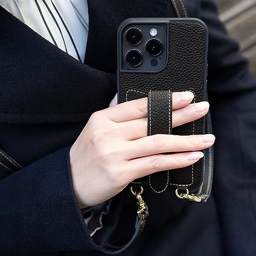 COGUREが独自考案した、斬新な落下防止ベルトデザインが特徴です。スナップボタンで簡単にサイズ調整ができ、ベルトがケースの中央に配置されており、左右から持ちやすいです。ベルトの表側はシュリンクカーフレザー、裏側はスムースレザーで、柔らかく滑らかな触り心地を提供します。