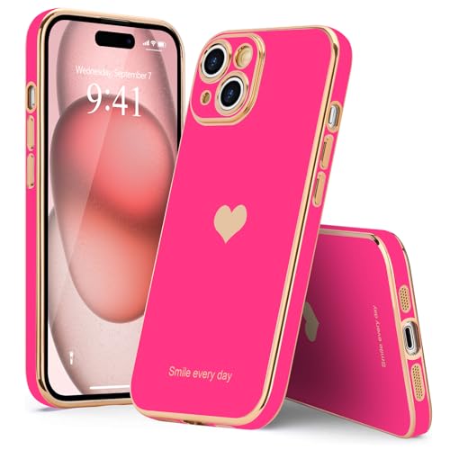 Teageo iPhone 15 Plus 用 ケース 【1枚ケース+2枚ガラスフィルム】 全面保護 女の子 可愛い おしゃれ ハート スマホケース 薄型 耐衝撃 落下防止 メッキ加工 アイフォン 15 Plus 適用 保護カバー(ローズレッド)