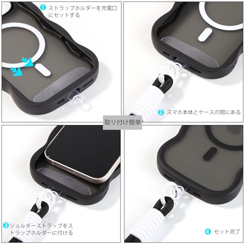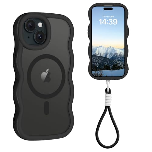 Telaso iphone15 ケース iPhone 15 用ケース iphone15ケース magsafe対応 手首ストラップ付き ウェーブ 波状エッジ 耐衝撃 アイフォン15 ケース 落下防止 iphone 15ケース 半透明 薄型 軽量 指紋防止 レンズ保護 ワイヤレス充電対応 6.1インチ ブラック