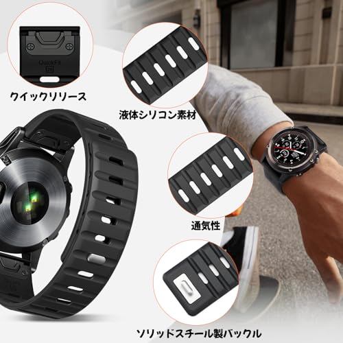 26mm交換バンド For GARMIN(ガーミン)Fenix 8 51mm / epix Pro 51mm / Fenix 7X / 6X / Enduro/Instinct 2X / Tactix Delta/Instinct 3 50mm 用バンド クイックフィットQuickFit 交換ベルト マグネット式 磁気吸着 シリコン表面 防水 スポーツストラップ (ブラック)