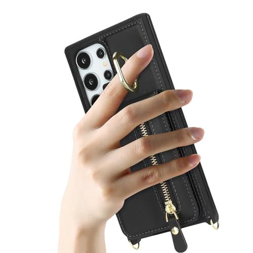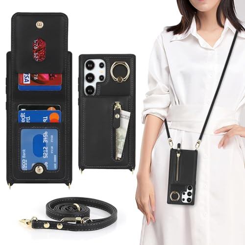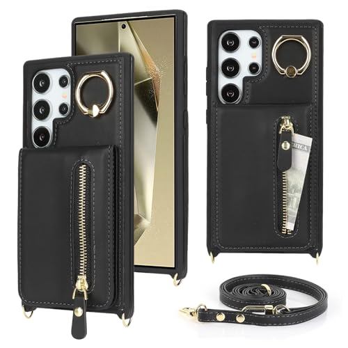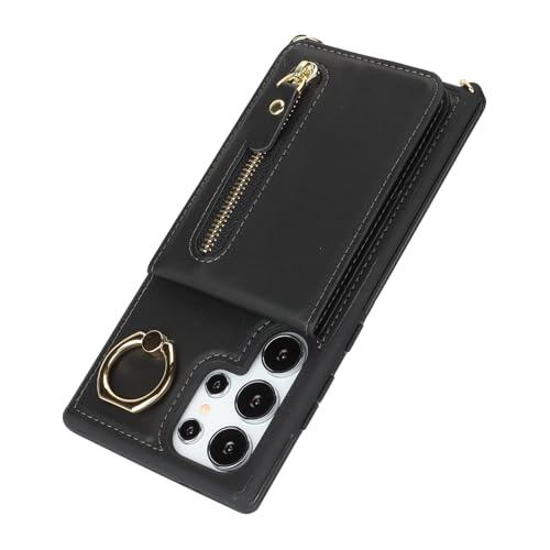 Galaxy S24 Ultra ケース ショルダー ストラップ付き ショルダーケース 背面フリップ 上下開 手帳型 Galaxy S24 Ultra SC-52E docomo SCG26 au 対応 サムスン ギャラクシー S24ウルトラ カバー case 適用 iCoverCase リング付き カード収納 縦置き 横置き スタンド 肩がけ 首掛け 斜め掛け カバー ブラック