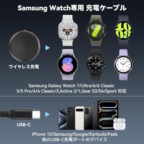 【幅広い互換性】本製品はSamsung Galaxy Watch 7/Ultra/6/6 Classic/5 Pro/5/4/4 Classic/3/Active 2/1に完全対応。さらに、着脱式Type-CケーブルはSamsungスマホ、Google Pixel、iPhone 16/15 Proシリーズ、その他USB-C対応デバイスの充電にも使用可能です。