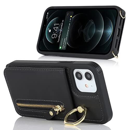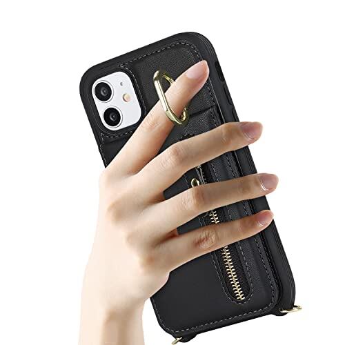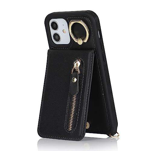 iCoverCase スマホケース 適用 アイフォン12mini ケース アイフォン 用 ショルダー ストラップ 背面フリップ 手帳型 上下開 アップル 12ミニ 適用 case リング カード収納 スタント 肩がけ 首掛け 斜め掛け ファスナー ストラップ付き ショルダーケース カード入れ カバー ブラック
