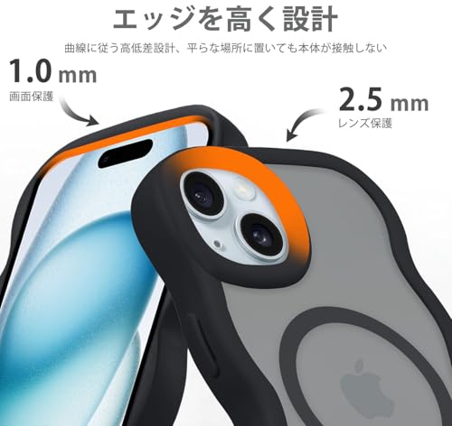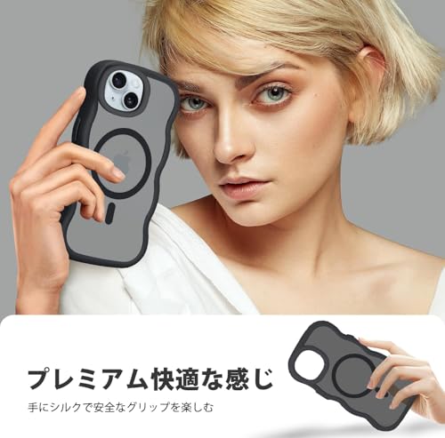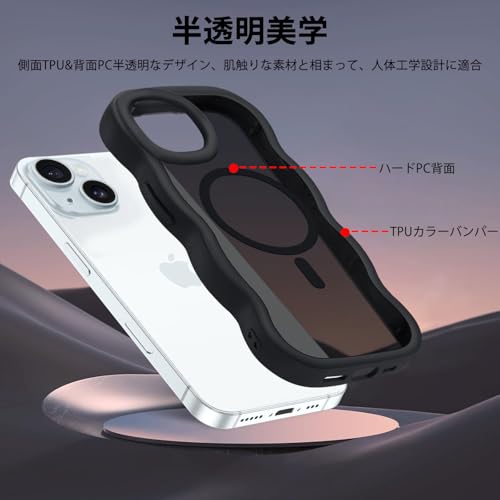 iPhone 15 用 ケース MagSafe対応 ワイヤレス充電 いphone15 カバー 半クリア 耐衝撃 波型 うねうね かわいい 韓国 アイフォン15 スマホケース 半透明 指紋防止 ストラップホール付き おしゃれ ウェーブカバー (ブラック)