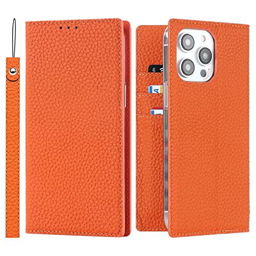 Jaorty Iphone 15 Pro と互換性のあるケース 手帳型 アイフォン 15 Pro 用のスマホケース 財布型 本革 肩掛け 斜めがけ おしゃれ ジッパー小銭入れ カード収納 横置き-オレンジ