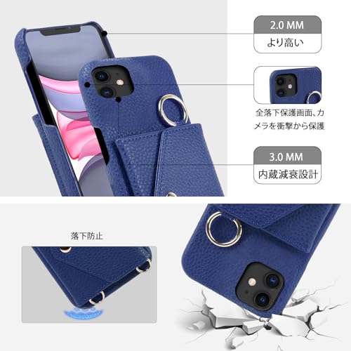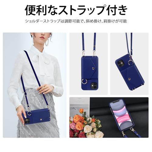 CASAFUNY iphone 11 ケース 手帳型 ショルダー 調節可能なショルダーストラップ 首掛け 肩掛け 斜めがけ レディース 化粧鏡 カードケース 携帯カバー アイフォン11 ケース 手帳型カード収納 縦置き 横置き スタンド 耐衝撃 肌感PUレザー シンプル 軽量 カバー スマホケース(6.1インチ)ブルー