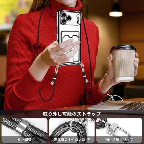iPhone 17 Pro ケース クリア ショルダー iphone 17 pro カバー カード収納 アイフォン 17Pro スマホケース 肩掛け 首かけ 斜めがけ 縄掛け ケース 透明 TPU 耐衝撃 薄型 軽量 カード入れ 財布型 スマホケース 調節可能な 落下防止 紛失防止 (ブラック)