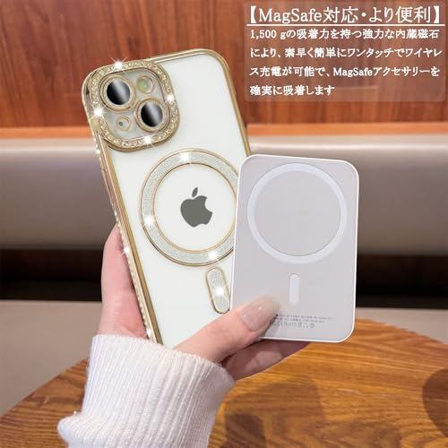 JOOBOY スマホケース 対応 iPhone 15 クリア ケース 透明 メッキ加工 Magsafe対応 きらきら ブリンブリン 衝撃吸収 かわいい キラキラ 女性 人気 キャラクター ワイヤレス充電対応 おしゃれ ストラップホール付き アイフォン15 携帯カバー (ゴールド, iPhone 15)