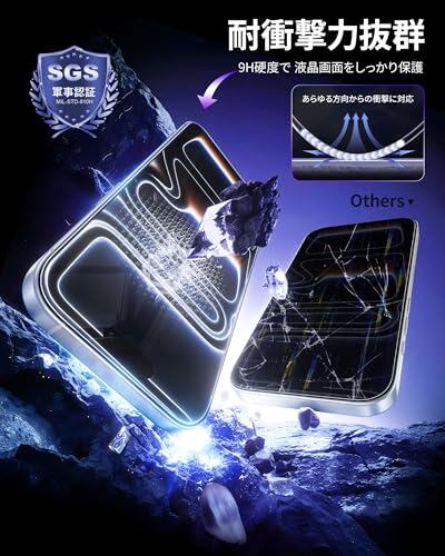 「耐衝撃・飛散防止」米軍規格「MIL-STD-810H」に準拠(認証番号:SZXEC23002005001)9H表面硬度ガラスを採用しており、外部からの衝撃を吸収し、画面へのダメージを最小限に抑えます。鞄やポケットのなかで鍵などの鋭いものにぶつかっても傷が付きにくいです。飛散防止加工により、万が一割れてもガラス破片が飛び散ることなく安心して使えます。