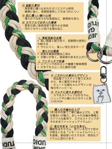 [Oumino] スマホストラップ スマホハンドストラップ 携帯ストラップ リストストラップ 編み込み 猫チャーム バッグストラップ iPhone 対応 手首ストラップ ポーチ飾り 極太 おしゃれ 可愛い 落下防止 アウトドア 全機種対応 (緑黒茶)