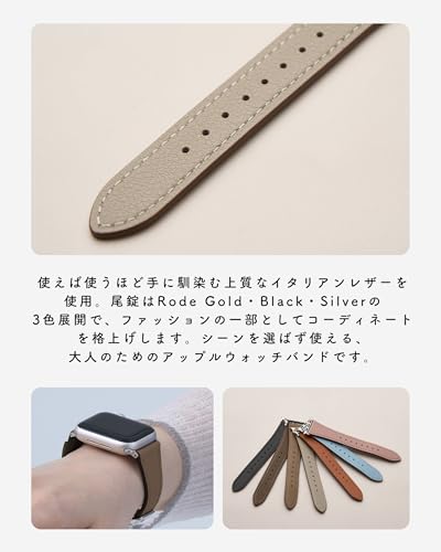 【ニュアンスカラーで色を楽しむ本革バンド】高級感のあるイタリアンレザーを使用し、長くお使いいただけるデザインと耐久性を実現。人気のニュアンスカラーで取り揃えたた本革レザーのアップルウォッチバンドです。日常使いからワンポイントになるカラーまでカラバリも豊富に取り揃え、カジュアルからフォーマルまで場面を問わずご使用いただけるデザインです。