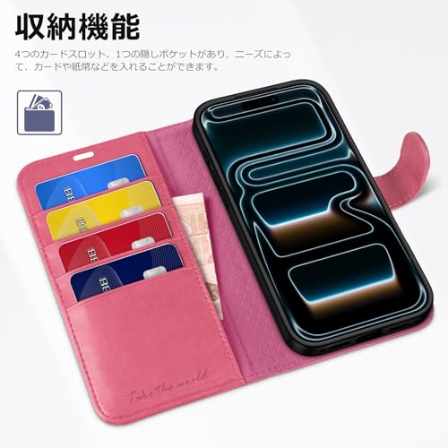 TUCCH iphone 17 Pro 対応 ケース手帳型 6.3インチ RFIDブロッキング 4つカードポケット付き ストラップホール 横置きスタンド機能 衝撃吸収 全面保護 PU合皮 TPU素材 マグネット式 アイホン17プロ対応 携帯カバー 2025年発売 5G ホットピンク