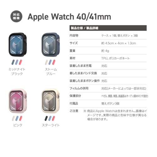 【製品仕様】… ◆ 対応機種 : Apple Watch SE2 SE / アップルウォッチ Series 9 8 7 6 5 4 / 40mm 41mm ◆ 内容物 : ケース × 1個、替えボタン × 3個 ◆ サイズ : 約 4.5cm × 4cm × 1.3cm ◆ 重量 : 約 4g ◆ 素材 : TPU、ポリカーボネート