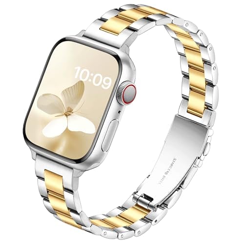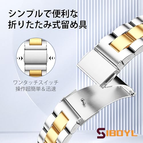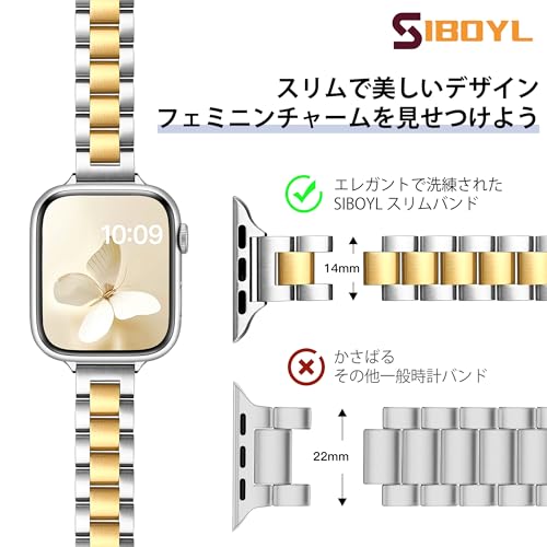 [SIBOYL] い細いステンレス対応アップルウォッチ バンド レディース46mm 45mm 44mm 49mm 42mm(Series 3 2 1)、着脱が簡単、おしゃれ かわいいコンパチブルApple Watch ベルト 、対応のあっふウォッチバンドステンレス夏、対応Apple Watch 11 10 Se ベルト 9 8 7 6 5 4 3 Ultra 3 2 1-シルバー&ゴールデン