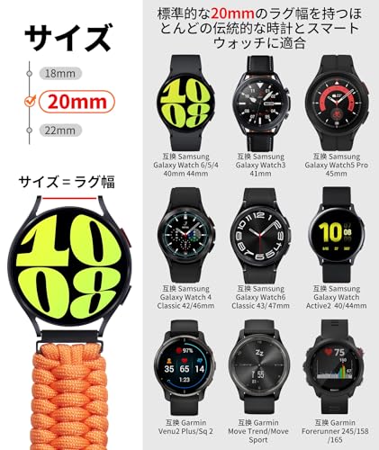 【対応機種】標準的なラグ幅 20mm のほとんどの従来の時計やスマートウォッチにフィットします。コンパチブルSamsung Galaxy Watch 6/5/4 44mm 40mm/ 互换Samsung Galaxy Watch 6 Classic 43mm 47mm/ 互换Galaxy Watch 5 Pro 45mm/ 互换Galaxy Watch 4 Classic 42mm 46mm/ 互换Galaxy Watch 3 41mm/ 互换Galaxy Watch 42mm/ Gear S2 Classic/ Gear Sport/ 互换Galaxy Watch Active 40mm/ 互换Galaxy Watch Active2 40mm 44mm; コンパチブルGarmin Vívoactive 5/ 3/ 3 Music/ 互换Venu/ 2 Plus/ Sq/ Sq Music/ 互换ガーミンVivomove/HR/Luxe/Style/ 互换Forerunner 645/ 245/ 55; 互换Amazfit GTS 2/ GTS 2 Mini/ GTS 2E。