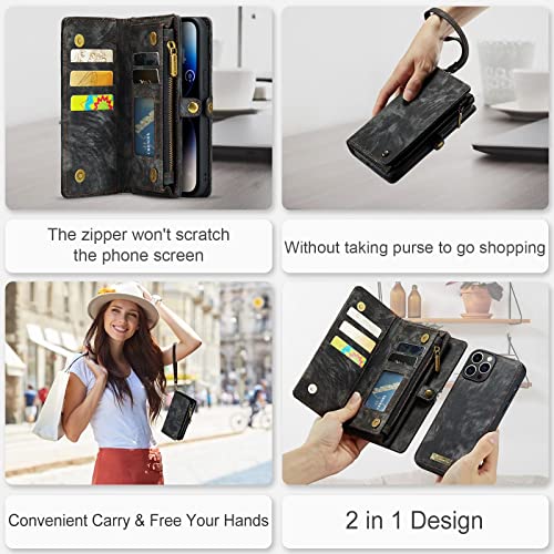 Fengyue iPhone 13 pro 用 ケース 財布型 カード収納 小銭入れ ワイヤレス充電 アイフォン 13 プロ カバー 手帳型 ストラップ 付き カードポケット付き 収納ポケット 2 in 1マグネット吸着 横置き スト耐衝撃 ラップホール付き