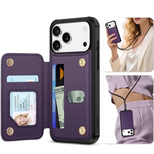 TUCCH iPhone 17Pro Max 対応 ケース ショルダーストラップ付き 背面カード収納 6.9インチ PUレザー RFIDブロッキング 3つカードポケット ストラップホール付き 取り外し不可 TPU素材 滑り止め 衝撃吸収 マグネット開閉 アイフォン17プロマックス対応携帯ケース 2025年発売 5G ダークパープル