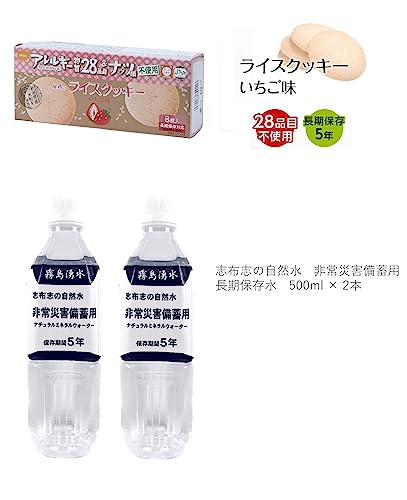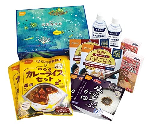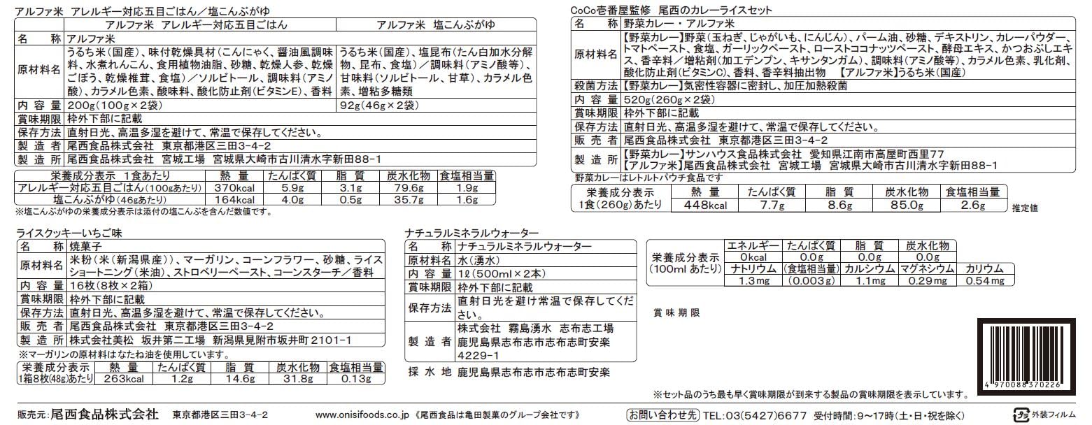 【セット内容】<br>・尾西のアレルギー対応五目ごはん 2袋<br>・塩こんぶがゆ 2袋<br>・CoCo壱番屋監修 尾西のカレーライスセット 2袋<br>・尾西のライスクッキーいちご味 2箱<br>・志布志の自然水 非常災害備蓄用 500ml 2本