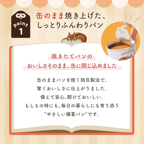 本商品は缶詰のようなプルトップ式の蓋を採用しているため、リング型のタブを手で引っ張るだけで開缶できます。その場に缶切りが無くてもパンをお召上がりいただけます。さらにトースターで焼いたり電子レンジで加熱することなく開けてすぐに食べられるところも魅力の1つです。パン缶は携帯しやすいので災害時以外に、登山・釣り・旅行などへも気軽に持ち歩けます。