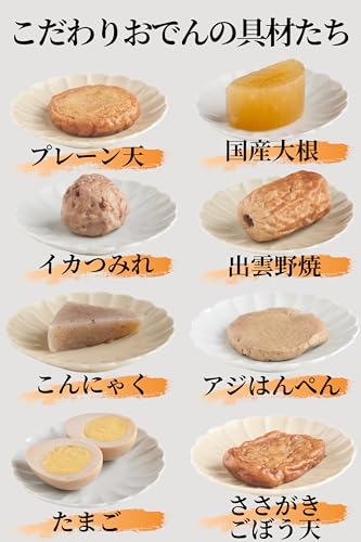 ✅️【厳選!8種の具材入り】… プレーン天、イカつみれ、アジはんぺん、出雲野焼、ささがきごぼう天、こんにゃく、大根、たまごが入っています。