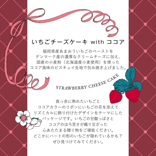 福岡県産あまおういちごのペーストをデンマーク産の濃厚なクリームチーズに加え、国産の小麦粉(北海道産小麦使用)を使ったココア風味のビスキュイ生地で包み焼き上げました。 あまおういちごの甘酸っぱさとココアのコクをお楽しみいただけるチーズケーキです。