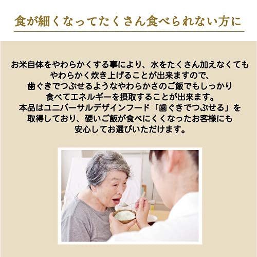 【食べやすさ】食べる力、飲み込む力、食欲がなくなってきた方向けのやわらかいごはん。お米の粒自体をやわらかくし、噛む力が弱まってきた方が食べやすいように調整しています。