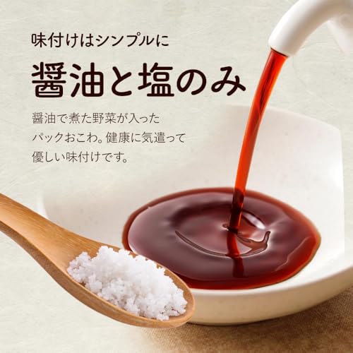 【味付けはシンプルに醤油と塩のみ】醤油で煮た野菜が入ったパックおこわ。健康に気遣って優しい味付け。濃すぎないのにしっかり旨味。野菜のおだしがしっかりお米に染み込み、噛めば噛むほど旨味を感じるおこわです。
