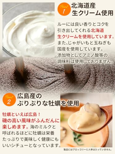 広島県産「かき」、北海道産の生クリーム、じゃがいもと国産の玉ねぎを使用したクリームシチューです。本当に美味しいシチューをお届けする為に守り続けている「コスモ直火焼き製法」 手間を惜しまず味を犠牲にしない「直火焼き製法」で作り続けています。