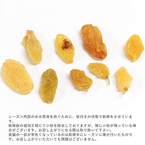 ご確認事項:※ノンコーティングのため、レーズンの水分が蒸発しやすい特性がございます。そのため表面が白くなる場合もございます。これは果糖が表面で結晶化したもので、品質には問題ございません。 レーズン内部の水分蒸発を防ぐために、枝付きの状態で乾燥をさせています。 乾燥後の選別工程にて小枝を除去しておりますが、稀に小枝が残っている場合がございます。お召し上がりになる際は取り除いて下さい。 表面の一部が茶色くなっているのは乾燥中にレーズンに傷が付いたものです。お召し上がりいただいても問題はございません。 ※情報更新のタイミングによっては、商品ラベルに記載の内容と異なる場合があります。ご使用の際は、商品ラベルを十分にご確認の上、ご使用ください。気になる点がございましたら、メールにてお問い合わせをお願いします。